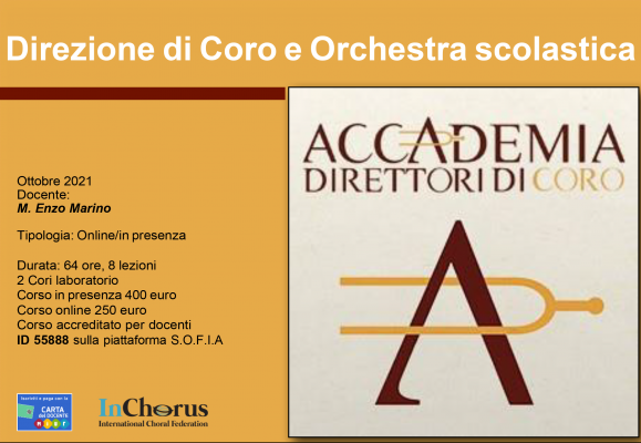 Percorso triennale in Direzione di Coro e orchestra scolastica, sono attivi i tre anni del percorso: Propedeutico, avanzato e specialistico. Corso a numero chiuso massimo 6 iscritti per annualità. Acquistabile anche con carta docente e valido alla formazione prevista per i docenti di ogni ordine e grado.