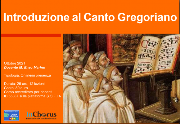 NUOVO CORSO di 25 ore di introduzione al Canto gregoriano. Il focus del percorso è quello di evidenziare il rapporto tra suono è senso che il gregoriano esprime con chiarezza e cristallina semplicità. Acquistabile anche con carta docente e valido alla formazione prevista per i docenti di ogni ordine e grado.
