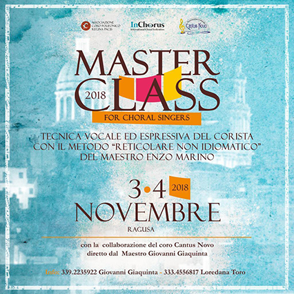 Il 3 e il 4 novembre 2018 l'ASSOCIAZIONE CORO POLIFONICO REGINA PACIS, in collaborazione con l'Associazione “Cantus Novo” con sede a Ragusa, organizza una “Masterclass in Direzione di Coro”